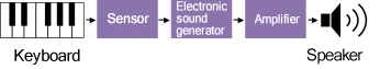 سنسورها میتوانند ظریفترین نوازندگی کلیدها را تشخیص دهند. صدای ضبط شده به صورت دیجیتال از یک گراند پیانو، تقویت شده و از بلندگوها پخش میشود. میتواند با استفاده از فناوری دیجیتال، افکتهای صوتی مانند ریورب و شبیهسازی فضای آکوستیک اجرای زنده در یک سالن بزرگ را ایجاد کند.